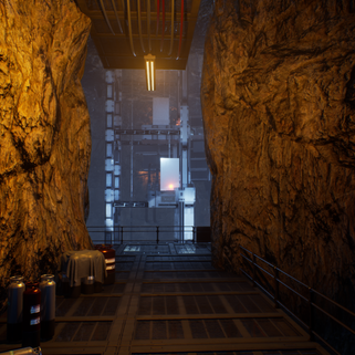 The layout is designed in a way that it resembles a mining facility inside a cave; labyrinthine cavities of diverse proportions connected with control stations, all positioned around a massive tower-like structure. This structure functions both as a point of reference throughout the level as well as the place players have to reach in order to complete the level. Players begin the level inside one of those cavities. Throughout their journey they are presented with a sequence of platforming and puzzle solving sections, which they have to overcome in order to escape the facility. It is important to note that the scripted cinematic events have functional impact on gameplay as they help players test specific mechanics or create new pathways for them. In this way, the level feels more as a dynamic, living world that reacts to players' actions.